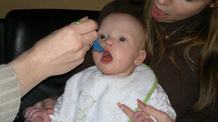 | 30-03. Het avond eten. Ik heb al steeds meer trek in eten. De fles gaat ook wel goed, maar het "normale" eten met een lepel vind ik wel heel erg leuk. |
