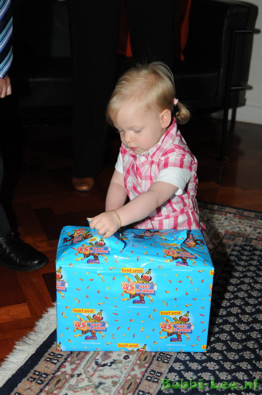 En toen begon het. De familie melde zich en de kado's kwamen binnen. Ze wist niet goed meer waar ze moest kijken. Ales eerste een pak van Overgroot Opa en Oma. |