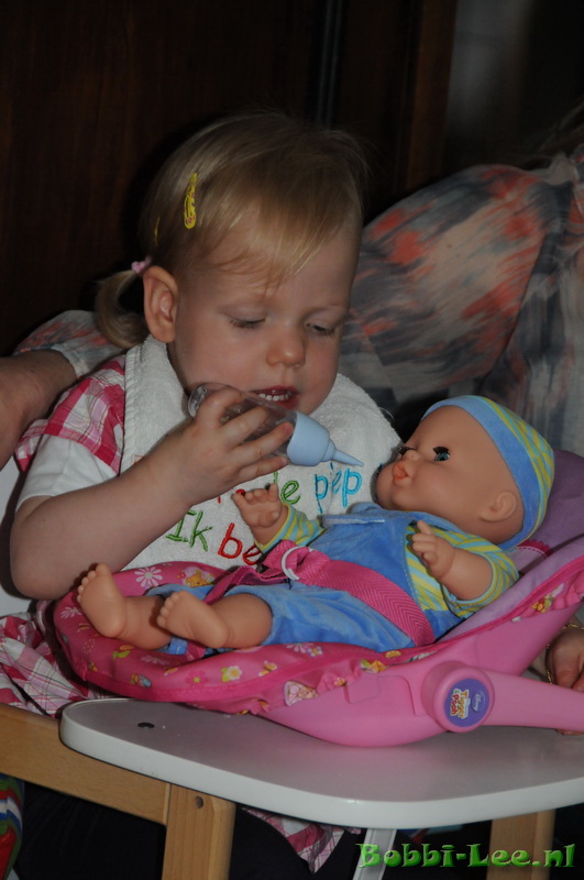 Zelfs tijdens de boterham moest de pop ook eten. |