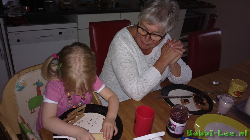 En daarna lekker eten. Mijn boterham was eerder op dan die van Oma. | ||