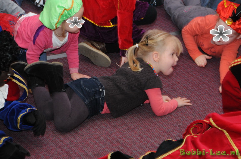 Met z'n alle dansen. De kindjes aan de ene kant en de Pieten aan de andere kant van de lijn. O ja, samen met madam. |