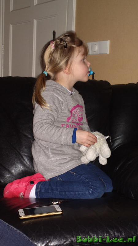 En dan komt het moment dat ze moe wordt. Lekker op de bank, knuffel erbij en tut in. |