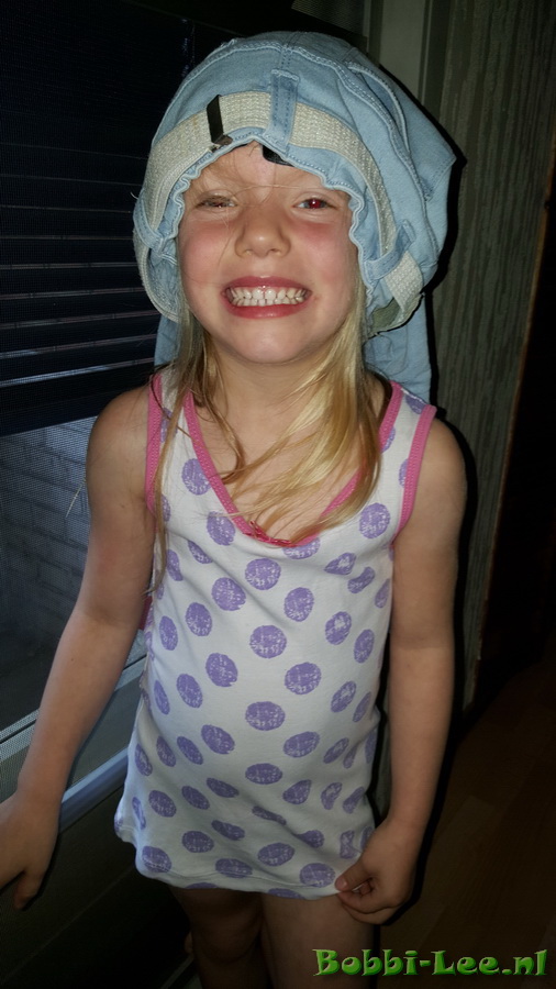 | Deze foto is gemaakt eind september. Na het zwemmen. Ze vond het leuk om zo over straat te gaan. |